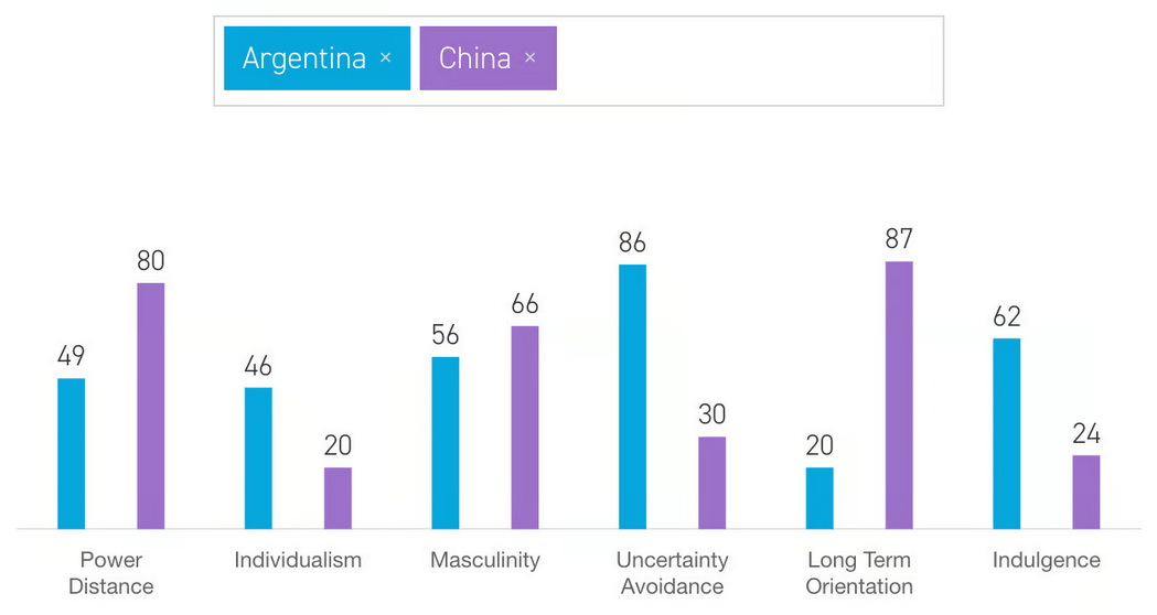 文化维度代表了区分国家(而不是个人)的文化倾向。各个维度上的国家/地区得分是相对的,因为我们都是人类,同时我们都是独一无二的。换句话说,文化只有通过比较才能被有意义地利用。