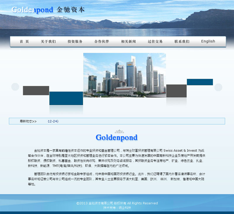 金驰资本是一家具有前瞻性资本运作的专业投资和基金管理公司,与瑞士财富投资管理有限公司 Swiss Asset & Invest 为战略合作伙伴,在全球特别是亚太地区投资和管理业务进行紧密合作。本公司主要为快速发展的中国高新科技企业及房地产开发商提供股权融资、债权融资、私募基金、融资性反向收购、兼并收购及财务咨询服务,其投融资业务专注房地产、矿业、绿色农业、乳业、新科技、新能源、TMT(电信/媒体/科技)、环保、大数据等在内的广泛领域。 管理团队由优秀投资银行家和金融专家组成,均来自中国和国际投资银行业。此外,我们还聘请了国内外著名律师事务所、会计事务所和证券公司与本公司组成一流的专业团队,其专业人士主要服务于澳大利亚、美国、欧洲、 非洲、 新加坡、香港和中国大陆等地。